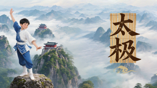 雾锁层峦,武当顶、童姿飒立。舒臂处、太极流转,意凝神谧。蓝袂翻飞追鹤影,白靴稳踏融云迹。望沧海、心与太虚同,乾坤寂。 山为骨,松作脊。风入韵,气成壁。任阴阳游走,静中藏力。一势推开平野阔,万思收尽幽怀逸。待霞归、笑看月升时,天地一。
