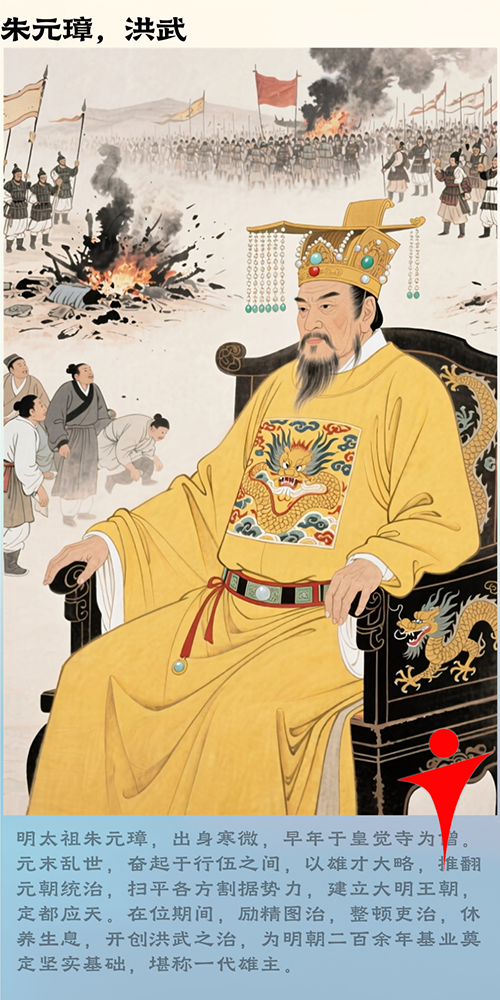 01.太祖高皇帝朱元璋:出身寒微,率义军推翻元朝,定都南京,建立大明。在位革新政治,废丞相,设三司,创洪武之治。然晚年嗜杀功臣,颇受诟病。