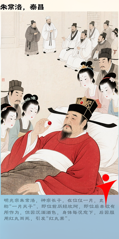 14.光宗贞皇帝朱常洛:历经储位之争,登基后虽有善政,却沉迷酒色,在位仅一月,因 “红丸案” 暴亡,成为明朝在位最短的皇帝。