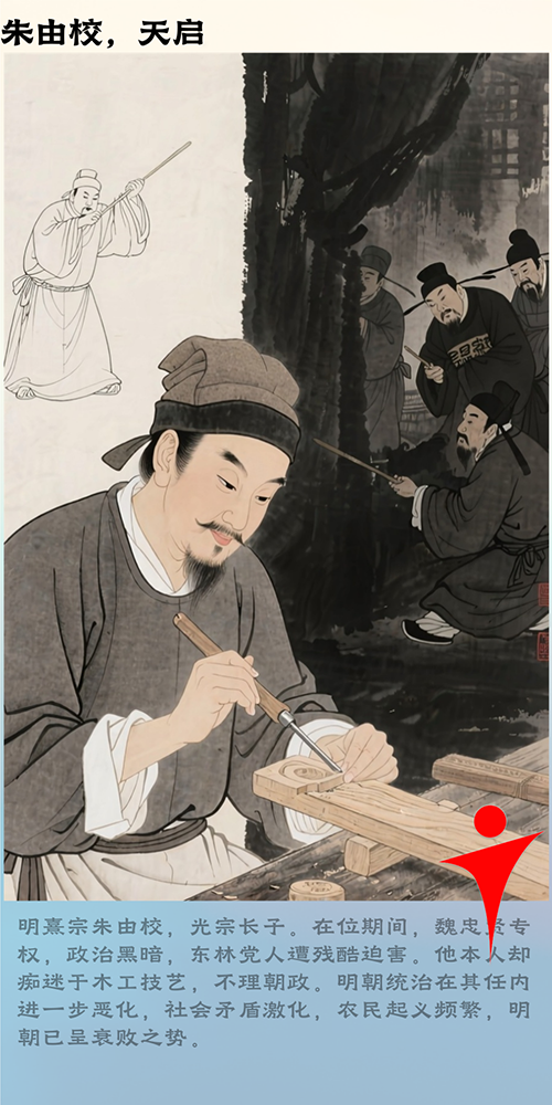 15.熹宗悊皇帝朱由校:痴迷木工,不理朝政,宠信魏忠贤,阉党肆虐,残害东林党人,加剧内忧外患,动摇明朝统治根基。