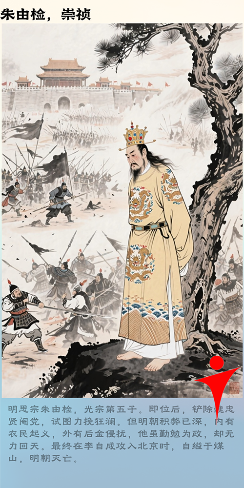 16.思宗烈皇帝朱由检:即位后铲除阉党,力图中兴。但生性多疑,举措失当,内忧外患之下,最终自缢于煤山,明朝覆灭。
