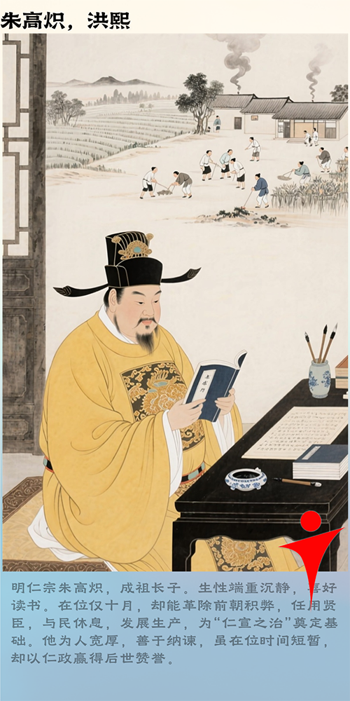 04.仁宗昭皇帝朱高炽:成祖长子,体肥性稳。在位十月,革除永乐朝弊政,推行休养生息之策,开启仁宣之治。惜英年早逝,未能大展宏图。