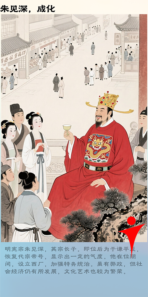 08.宪宗纯皇帝朱见深:恢复代宗帝号,为于谦平反。但宠信万贵妃,纵容西厂乱政,奸佞当道,致使后期朝政衰败,弊病丛生。