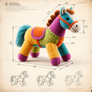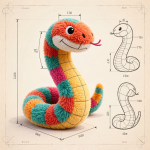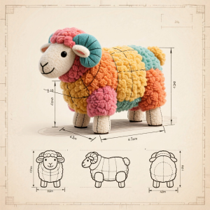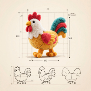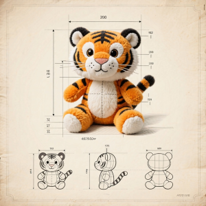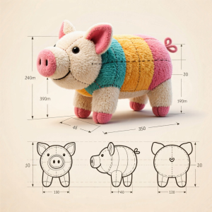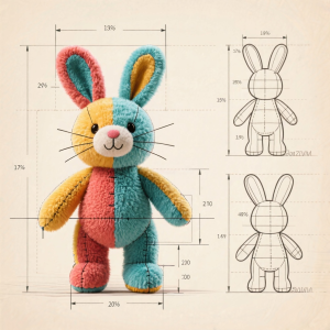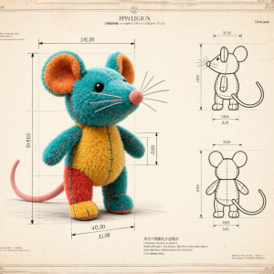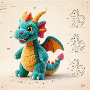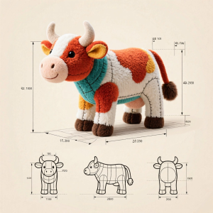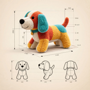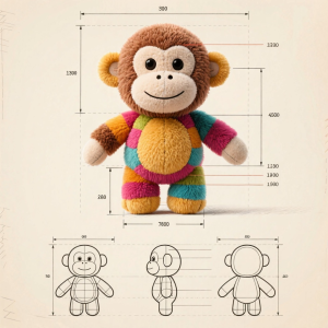 工作流-毛绒选项,提词:以蓝图的风格,为毛绒玩偶制作,设计草图。以用户输入的主题为元素。玩偶应该被描绘成一个有着典型特征的形象,颜色鲜艳,使用线条和测量值来指示各个部位的尺寸。除了主要设计外,还包括显示三视图,淡米色背景。